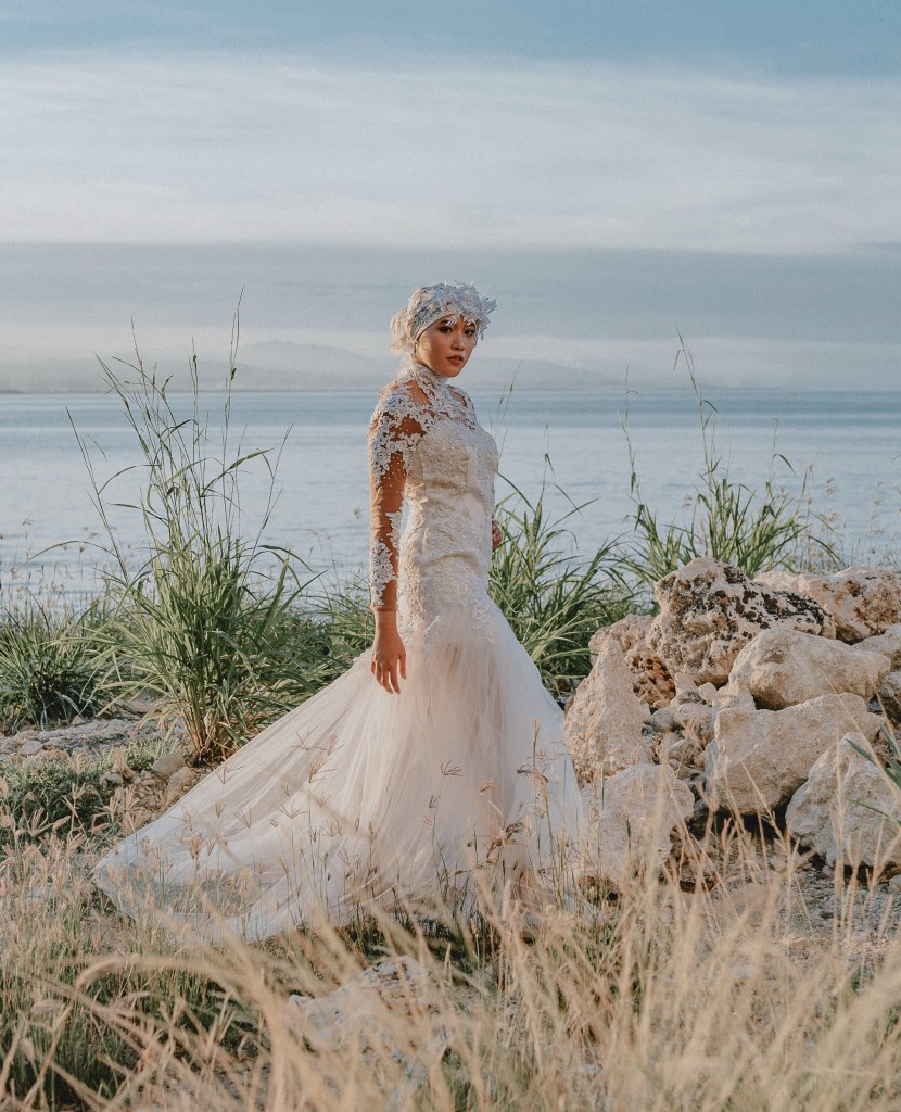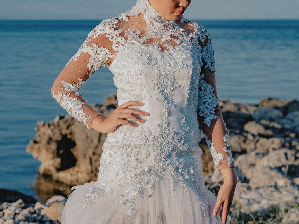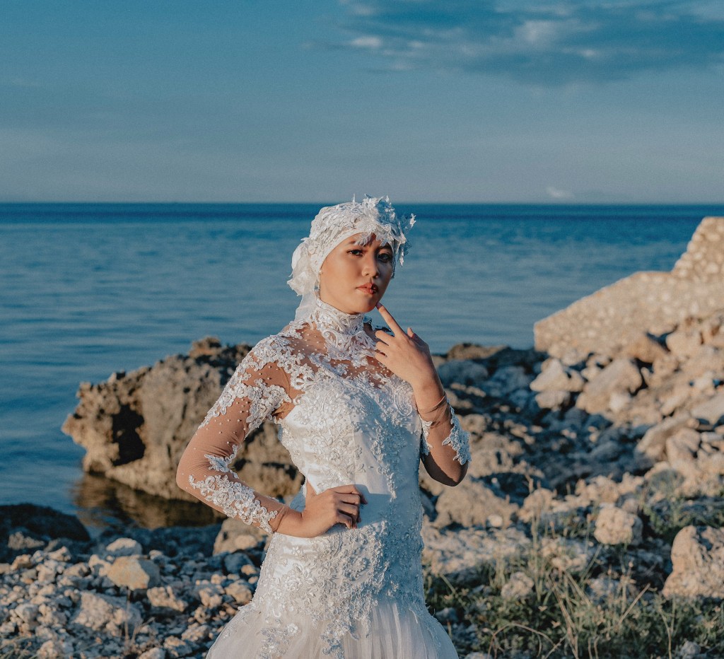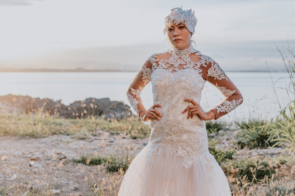 Brilliant white lace and beads embroidery using tiny shimmering crystals and cut beads to give this gown a nice textured look that glitters as you move. It has flounce tulle skirt that carves from the lower hip to contour, and an illusion skin-tone tulle sleeves if one wants to wear it without the inner blouse. The set comes with a long white beaded cape for a dramatic and ultra- feminine and modest look. Super lightweight and manageable