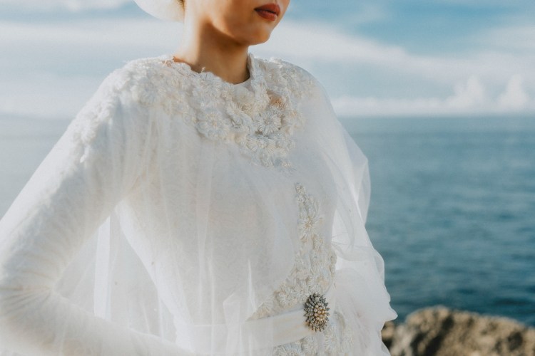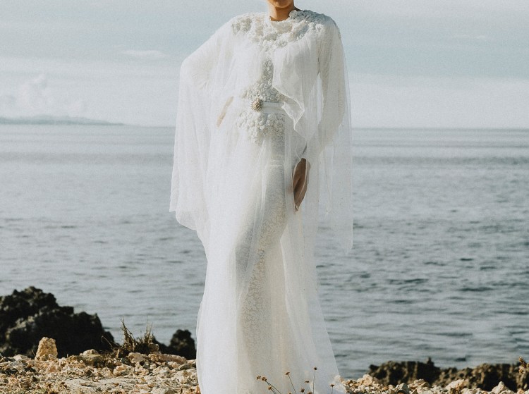 Serpentine cut lace gown with draped tulle overlay. Decorated with embossed appliques of opaque iridescent beads and Aurora Borealis crystals to highlight the shoulder area and focal point of the bodice . The front of the skirt area has a gathered draped feature to make it look more dramatic, and with a chapel- length train of tulle material. A combination of bold element and wispy textile that reminds us of corals beneath crystal- clear waters. Lightweight (not more than 1.5 kls) and manageable.