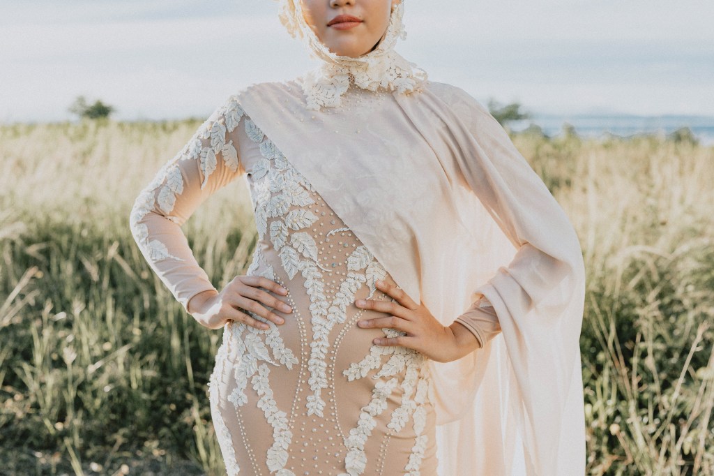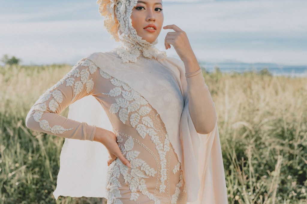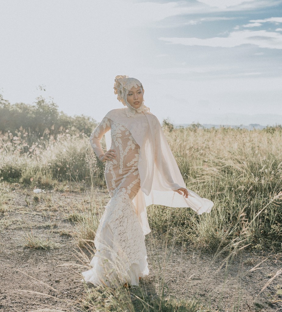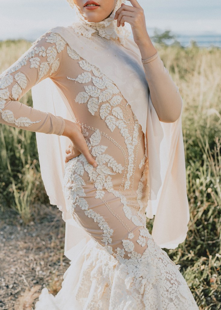 Two- piece gown with a mermaid silhouette. It comes with a beaded cape. The gown is decorated with beaded embossed lace cut-outs carefully placed in a pattern that mimics the wings of butterflies. The bottom features layers of tulle inserts to create a frothy look that is not overwhelming. With multitude scatters of Aurora Borealis crystals that catches light when the wearer moves. Magical and elegant versatile gown that can be worn on other occasions too. Super lightweight and manageable.