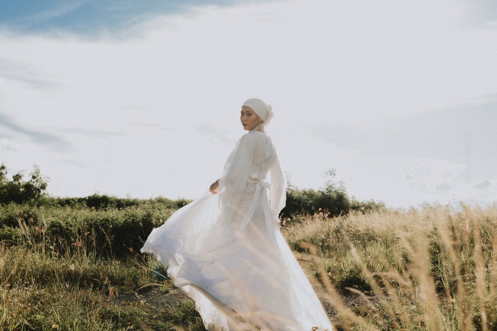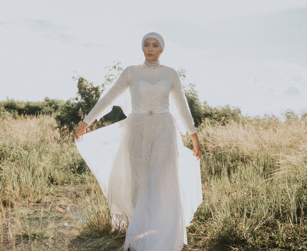 A convertible gown made of soft tulle. The main gown has a sheer sleeves and neckline, shirred layered tulle skirt with a chapel length train. It is decorated with iridescent sequins and crystal dusts in ornate patterns from top to bottom. Some patterns on the bodice is lined with opaque crystals and cut beads to make it pop. It comes with an inner full- sleeved skin-hugging blouse to wear underneath. Super light-weight and manageable.