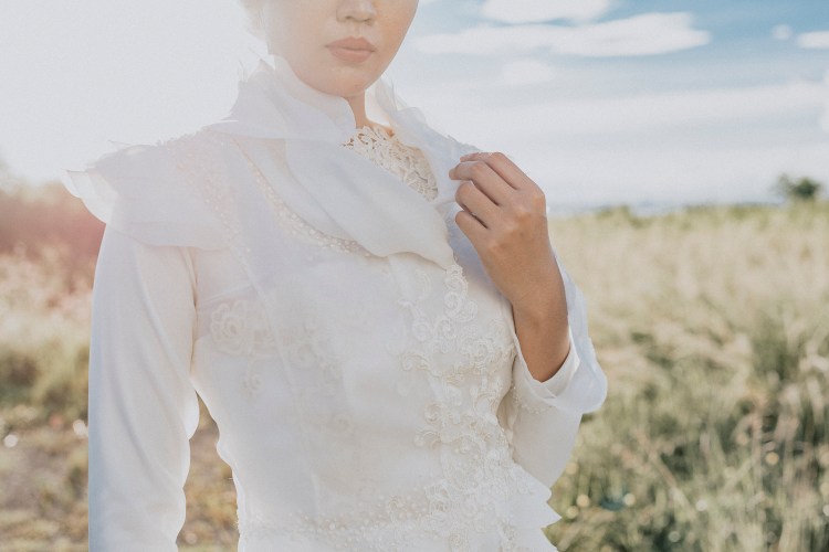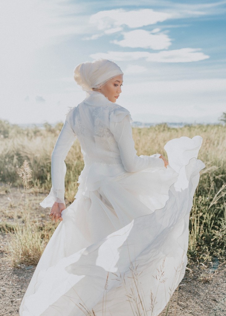 A two- piece wedding gown made of Jusi cloth. The outer blazer has irregular layers of ruffles on the collar, cuffs and hems to form a soft peplum effect, decorated with glass and cut beads, opaque crystals and lace cut-outs. The inner dress is a cap sleeve illusion-neck gown with full lace bodice and cascading down from the waist, with layers of ruffles on the train on the back of the dress to give that rippling effect as the bride walks. Super light-weight and manageable.